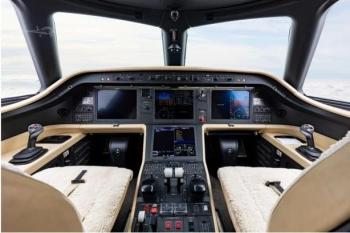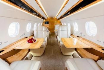 This interior seat 10 passengers, which includes a belted aft lavatory. It features a forward 4-place club seating with foldout tables and an aft section with a 3-person berthable divan opposite two club seats. Additional amenities include a fully equipped forward galley, an aft storage closet, and elegant stone flooring in the galley and lavatory.