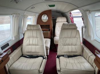 - Tan leather seats with burgundy carpet. Tan and burgundy sidewalls with brown wood tables and service bar. Good condition.
