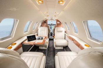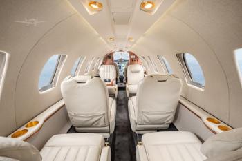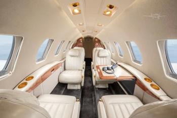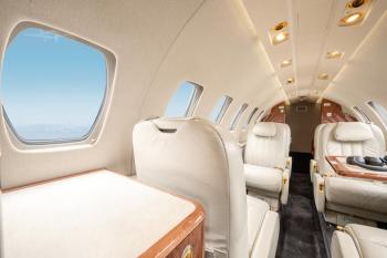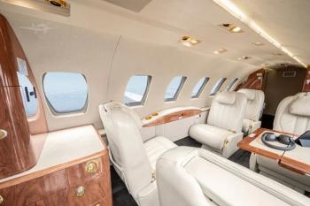 Executive seven (7) passenger Interior features a forward four-place (4) club, dual (2) aft forward-facing seats, and an (1) aft belted flushing lavatory. Overall tone is light beige, with cabinetry in Escada Gloss Laminate with Bright Satin Gold hardware. Cabin amenities include forward right refreshment center, forward left storage cabinet, dual portable DVD system and B&D Cabin Display. Solid Pocket Door to Lavatory