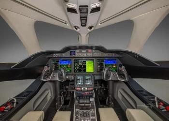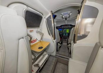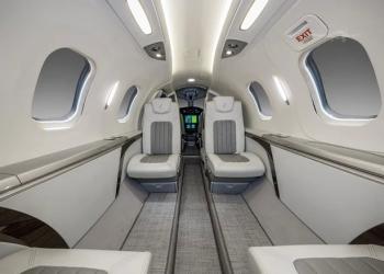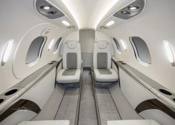- 6 Belted Passenger Seats Plus 2 Pilot's Seats with Option of 7 Belted Passengers Possible with Single-Pilot Ops. Cool Gray Monotone Elite Leather Seating, Forward Side-Facing Seat, 4-Place Club with Dual Stowable Executive Tables. Externally Serviceable Belted Aft Lav. Moonlight Interior Palette w/Cool Gray Base & Deep Gray Accents. Enhanced Cabin Management System. Solid Aft Cabin Door, Universal Power Outlets, Drink Holders, Lighted Logo Cabin Floor Trim, Electronically Dimmable Windows.
