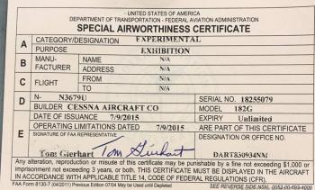 - Exhibition EXPERIMENTAL certificate plane no expiration on air worthiness certificate see pics . FLY IFR or VFR legal to fly day or nite in any air space has ADSB only limitation no commercial use .
