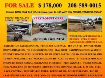 - This impressive 1963 Cessna 185 taildragger has been expertly converted from a 182G into an Exhibition EXPERIMENTAL aircraft, combining rugged backcountry capability with high-performance flight characteristics. Its powered by a 260HP turbocharged, fuel-injected engine, delivering consistent power at altitude and cruise speeds up to 180 MPH+ at 12K ASL .
