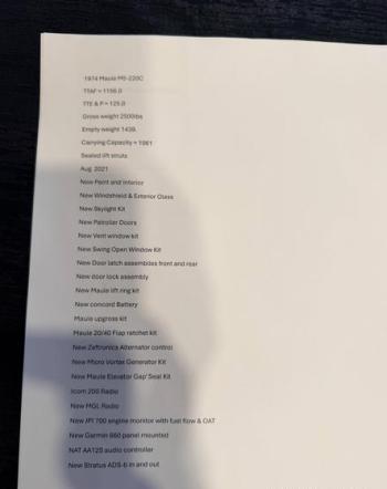 - Dual radios, New ADA-b in and out, lift reserve indicator, JPI 700 with fuel flow and OAT. Garmin 660 panel mounted Patroller doors and skylight 8.50X6 tires, New factory exhaust with 2 hours on them. All new scat hoses etc.